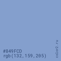 Цвет #849FCD в цветовой модели RGB обозначается тремя октетами (132, 159, 205) в десятичном формате и #849FCD в шестнадцатиричном (hex) формате, которые являются интенсивностью красного 132 (hex 84), интенсивность зелёного 159 (hex 9F) и интенсивность синего 205 (hex CD).
