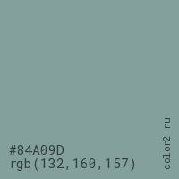 Цвет #84A09D в цветовой модели RGB обозначается тремя октетами (132, 160, 157) в десятичном формате и #84A09D в шестнадцатиричном (hex) формате, которые являются интенсивностью красного 132 (hex 84), интенсивность зелёного 160 (hex A0) и интенсивность синего 157 (hex 9D).