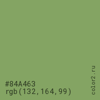 Цвет #84A463 в цветовой модели RGB обозначается тремя октетами (132, 164, 99) в десятичном формате и #84A463 в шестнадцатиричном (hex) формате, которые являются интенсивностью красного 132 (hex 84), интенсивность зелёного 164 (hex A4) и интенсивность синего 99 (hex 63).