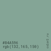 Цвет #84A596 в цветовой модели RGB обозначается тремя октетами (132, 165, 150) в десятичном формате и #84A596 в шестнадцатиричном (hex) формате, которые являются интенсивностью красного 132 (hex 84), интенсивность зелёного 165 (hex A5) и интенсивность синего 150 (hex 96).
