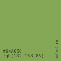 Цвет #84A856 в цветовой модели RGB обозначается тремя октетами (132, 168, 86) в десятичном формате и #84A856 в шестнадцатиричном (hex) формате, которые являются интенсивностью красного 132 (hex 84), интенсивность зелёного 168 (hex A8) и интенсивность синего 86 (hex 56).