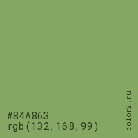 Цвет #84A863 в цветовой модели RGB обозначается тремя октетами (132, 168, 99) в десятичном формате и #84A863 в шестнадцатиричном (hex) формате, которые являются интенсивностью красного 132 (hex 84), интенсивность зелёного 168 (hex A8) и интенсивность синего 99 (hex 63).