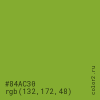 Цвет #84AC30 в цветовой модели RGB обозначается тремя октетами (132, 172, 48) в десятичном формате и #84AC30 в шестнадцатиричном (hex) формате, которые являются интенсивностью красного 132 (hex 84), интенсивность зелёного 172 (hex AC) и интенсивность синего 48 (hex 30).