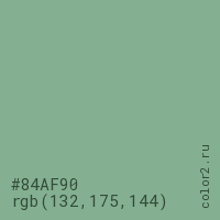 Цвет #84AF90 в цветовой модели RGB обозначается тремя октетами (132, 175, 144) в десятичном формате и #84AF90 в шестнадцатиричном (hex) формате, которые являются интенсивностью красного 132 (hex 84), интенсивность зелёного 175 (hex AF) и интенсивность синего 144 (hex 90).