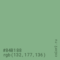 Цвет #84B188 в цветовой модели RGB обозначается тремя октетами (132, 177, 136) в десятичном формате и #84B188 в шестнадцатиричном (hex) формате, которые являются интенсивностью красного 132 (hex 84), интенсивность зелёного 177 (hex B1) и интенсивность синего 136 (hex 88).