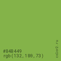 Цвет #84B449 в цветовой модели RGB обозначается тремя октетами (132, 180, 73) в десятичном формате и #84B449 в шестнадцатиричном (hex) формате, которые являются интенсивностью красного 132 (hex 84), интенсивность зелёного 180 (hex B4) и интенсивность синего 73 (hex 49).