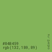 Цвет #84B459 в цветовой модели RGB обозначается тремя октетами (132, 180, 89) в десятичном формате и #84B459 в шестнадцатиричном (hex) формате, которые являются интенсивностью красного 132 (hex 84), интенсивность зелёного 180 (hex B4) и интенсивность синего 89 (hex 59).