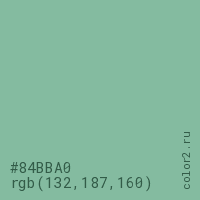 Цвет #84BBA0 в цветовой модели RGB обозначается тремя октетами (132, 187, 160) в десятичном формате и #84BBA0 в шестнадцатиричном (hex) формате, которые являются интенсивностью красного 132 (hex 84), интенсивность зелёного 187 (hex BB) и интенсивность синего 160 (hex A0).