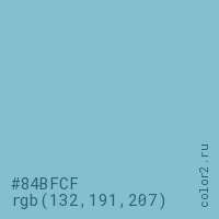 Цвет #84BFCF в цветовой модели RGB обозначается тремя октетами (132, 191, 207) в десятичном формате и #84BFCF в шестнадцатиричном (hex) формате, которые являются интенсивностью красного 132 (hex 84), интенсивность зелёного 191 (hex BF) и интенсивность синего 207 (hex CF).
