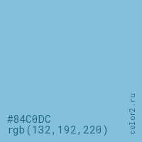 Цвет #84C0DC в цветовой модели RGB обозначается тремя октетами (132, 192, 220) в десятичном формате и #84C0DC в шестнадцатиричном (hex) формате, которые являются интенсивностью красного 132 (hex 84), интенсивность зелёного 192 (hex C0) и интенсивность синего 220 (hex DC).