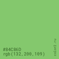 Цвет #84C86D в цветовой модели RGB обозначается тремя октетами (132, 200, 109) в десятичном формате и #84C86D в шестнадцатиричном (hex) формате, которые являются интенсивностью красного 132 (hex 84), интенсивность зелёного 200 (hex C8) и интенсивность синего 109 (hex 6D).