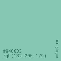 Цвет #84C8B3 в цветовой модели RGB обозначается тремя октетами (132, 200, 179) в десятичном формате и #84C8B3 в шестнадцатиричном (hex) формате, которые являются интенсивностью красного 132 (hex 84), интенсивность зелёного 200 (hex C8) и интенсивность синего 179 (hex B3).