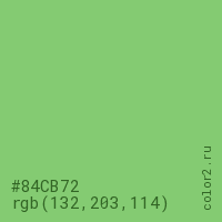 Цвет #84CB72 в цветовой модели RGB обозначается тремя октетами (132, 203, 114) в десятичном формате и #84CB72 в шестнадцатиричном (hex) формате, которые являются интенсивностью красного 132 (hex 84), интенсивность зелёного 203 (hex CB) и интенсивность синего 114 (hex 72).