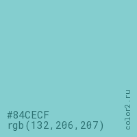 Цвет #84CECF в цветовой модели RGB обозначается тремя октетами (132, 206, 207) в десятичном формате и #84CECF в шестнадцатиричном (hex) формате, которые являются интенсивностью красного 132 (hex 84), интенсивность зелёного 206 (hex CE) и интенсивность синего 207 (hex CF).