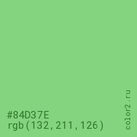 Цвет #84D37E в цветовой модели RGB обозначается тремя октетами (132, 211, 126) в десятичном формате и #84D37E в шестнадцатиричном (hex) формате, которые являются интенсивностью красного 132 (hex 84), интенсивность зелёного 211 (hex D3) и интенсивность синего 126 (hex 7E).