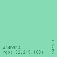 Цвет #84DBB4 в цветовой модели RGB обозначается тремя октетами (132, 219, 180) в десятичном формате и #84DBB4 в шестнадцатиричном (hex) формате, которые являются интенсивностью красного 132 (hex 84), интенсивность зелёного 219 (hex DB) и интенсивность синего 180 (hex B4).