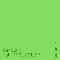 Цвет #84DC61 в цветовой модели RGB обозначается тремя октетами (132, 220, 97) в десятичном формате и #84DC61 в шестнадцатиричном (hex) формате, которые являются интенсивностью красного 132 (hex 84), интенсивность зелёного 220 (hex DC) и интенсивность синего 97 (hex 61).