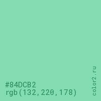 Цвет #84DCB2 в цветовой модели RGB обозначается тремя октетами (132, 220, 178) в десятичном формате и #84DCB2 в шестнадцатиричном (hex) формате, которые являются интенсивностью красного 132 (hex 84), интенсивность зелёного 220 (hex DC) и интенсивность синего 178 (hex B2).