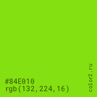 Цвет #84E010 в цветовой модели RGB обозначается тремя октетами (132, 224, 16) в десятичном формате и #84E010 в шестнадцатиричном (hex) формате, которые являются интенсивностью красного 132 (hex 84), интенсивность зелёного 224 (hex E0) и интенсивность синего 16 (hex 10).