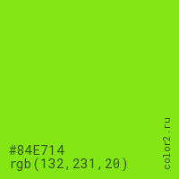 Цвет #84E714 в цветовой модели RGB обозначается тремя октетами (132, 231, 20) в десятичном формате и #84E714 в шестнадцатиричном (hex) формате, которые являются интенсивностью красного 132 (hex 84), интенсивность зелёного 231 (hex E7) и интенсивность синего 20 (hex 14).