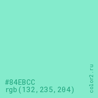 Цвет #84EBCC в цветовой модели RGB обозначается тремя октетами (132, 235, 204) в десятичном формате и #84EBCC в шестнадцатиричном (hex) формате, которые являются интенсивностью красного 132 (hex 84), интенсивность зелёного 235 (hex EB) и интенсивность синего 204 (hex CC).