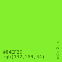 Цвет #84EF2C в цветовой модели RGB обозначается тремя октетами (132, 239, 44) в десятичном формате и #84EF2C в шестнадцатиричном (hex) формате, которые являются интенсивностью красного 132 (hex 84), интенсивность зелёного 239 (hex EF) и интенсивность синего 44 (hex 2C).