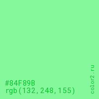 Цвет #84F89B в цветовой модели RGB обозначается тремя октетами (132, 248, 155) в десятичном формате и #84F89B в шестнадцатиричном (hex) формате, которые являются интенсивностью красного 132 (hex 84), интенсивность зелёного 248 (hex F8) и интенсивность синего 155 (hex 9B).