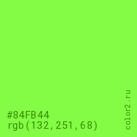 Цвет #84FB44 в цветовой модели RGB обозначается тремя октетами (132, 251, 68) в десятичном формате и #84FB44 в шестнадцатиричном (hex) формате, которые являются интенсивностью красного 132 (hex 84), интенсивность зелёного 251 (hex FB) и интенсивность синего 68 (hex 44).