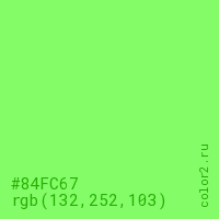 Цвет #84FC67 в цветовой модели RGB обозначается тремя октетами (132, 252, 103) в десятичном формате и #84FC67 в шестнадцатиричном (hex) формате, которые являются интенсивностью красного 132 (hex 84), интенсивность зелёного 252 (hex FC) и интенсивность синего 103 (hex 67).