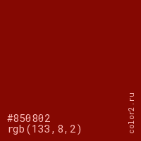 Цвет #850802 в цветовой модели RGB обозначается тремя октетами (133, 8, 2) в десятичном формате и #850802 в шестнадцатиричном (hex) формате, которые являются интенсивностью красного 133 (hex 85), интенсивность зелёного 8 (hex 08) и интенсивность синего 2 (hex 02).