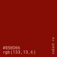 Цвет #850D06 в цветовой модели RGB обозначается тремя октетами (133, 13, 6) в десятичном формате и #850D06 в шестнадцатиричном (hex) формате, которые являются интенсивностью красного 133 (hex 85), интенсивность зелёного 13 (hex 0D) и интенсивность синего 6 (hex 06).