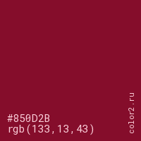 Цвет #850D2B в цветовой модели RGB обозначается тремя октетами (133, 13, 43) в десятичном формате и #850D2B в шестнадцатиричном (hex) формате, которые являются интенсивностью красного 133 (hex 85), интенсивность зелёного 13 (hex 0D) и интенсивность синего 43 (hex 2B).