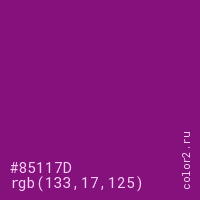 Цвет #85117D в цветовой модели RGB обозначается тремя октетами (133, 17, 125) в десятичном формате и #85117D в шестнадцатиричном (hex) формате, которые являются интенсивностью красного 133 (hex 85), интенсивность зелёного 17 (hex 11) и интенсивность синего 125 (hex 7D).