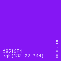 Цвет #8516F4 в цветовой модели RGB обозначается тремя октетами (133, 22, 244) в десятичном формате и #8516F4 в шестнадцатиричном (hex) формате, которые являются интенсивностью красного 133 (hex 85), интенсивность зелёного 22 (hex 16) и интенсивность синего 244 (hex F4).