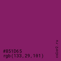 Цвет #851D65 в цветовой модели RGB обозначается тремя октетами (133, 29, 101) в десятичном формате и #851D65 в шестнадцатиричном (hex) формате, которые являются интенсивностью красного 133 (hex 85), интенсивность зелёного 29 (hex 1D) и интенсивность синего 101 (hex 65).