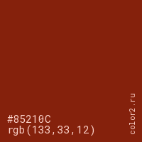 Цвет #85210C в цветовой модели RGB обозначается тремя октетами (133, 33, 12) в десятичном формате и #85210C в шестнадцатиричном (hex) формате, которые являются интенсивностью красного 133 (hex 85), интенсивность зелёного 33 (hex 21) и интенсивность синего 12 (hex 0C).