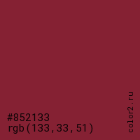 Цвет #852133 в цветовой модели RGB обозначается тремя октетами (133, 33, 51) в десятичном формате и #852133 в шестнадцатиричном (hex) формате, которые являются интенсивностью красного 133 (hex 85), интенсивность зелёного 33 (hex 21) и интенсивность синего 51 (hex 33).