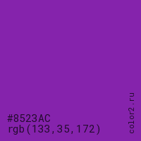 Цвет #8523AC в цветовой модели RGB обозначается тремя октетами (133, 35, 172) в десятичном формате и #8523AC в шестнадцатиричном (hex) формате, которые являются интенсивностью красного 133 (hex 85), интенсивность зелёного 35 (hex 23) и интенсивность синего 172 (hex AC).