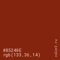 Цвет #85240E в цветовой модели RGB обозначается тремя октетами (133, 36, 14) в десятичном формате и #85240E в шестнадцатиричном (hex) формате, которые являются интенсивностью красного 133 (hex 85), интенсивность зелёного 36 (hex 24) и интенсивность синего 14 (hex 0E).