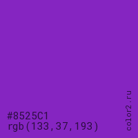 Цвет #8525C1 в цветовой модели RGB обозначается тремя октетами (133, 37, 193) в десятичном формате и #8525C1 в шестнадцатиричном (hex) формате, которые являются интенсивностью красного 133 (hex 85), интенсивность зелёного 37 (hex 25) и интенсивность синего 193 (hex C1).