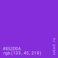 Цвет #852DDA в цветовой модели RGB обозначается тремя октетами (133, 45, 218) в десятичном формате и #852DDA в шестнадцатиричном (hex) формате, которые являются интенсивностью красного 133 (hex 85), интенсивность зелёного 45 (hex 2D) и интенсивность синего 218 (hex DA).