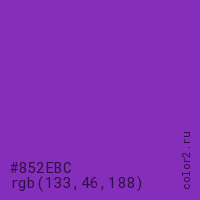 Цвет #852EBC в цветовой модели RGB обозначается тремя октетами (133, 46, 188) в десятичном формате и #852EBC в шестнадцатиричном (hex) формате, которые являются интенсивностью красного 133 (hex 85), интенсивность зелёного 46 (hex 2E) и интенсивность синего 188 (hex BC).