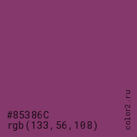 Цвет #85386C в цветовой модели RGB обозначается тремя октетами (133, 56, 108) в десятичном формате и #85386C в шестнадцатиричном (hex) формате, которые являются интенсивностью красного 133 (hex 85), интенсивность зелёного 56 (hex 38) и интенсивность синего 108 (hex 6C).