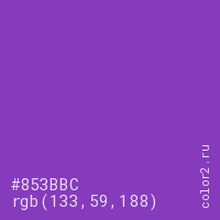 Цвет #853BBC в цветовой модели RGB обозначается тремя октетами (133, 59, 188) в десятичном формате и #853BBC в шестнадцатиричном (hex) формате, которые являются интенсивностью красного 133 (hex 85), интенсивность зелёного 59 (hex 3B) и интенсивность синего 188 (hex BC).