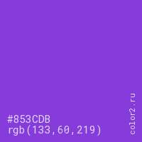 Цвет #853CDB в цветовой модели RGB обозначается тремя октетами (133, 60, 219) в десятичном формате и #853CDB в шестнадцатиричном (hex) формате, которые являются интенсивностью красного 133 (hex 85), интенсивность зелёного 60 (hex 3C) и интенсивность синего 219 (hex DB).