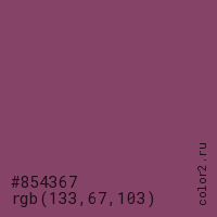Цвет #854367 в цветовой модели RGB обозначается тремя октетами (133, 67, 103) в десятичном формате и #854367 в шестнадцатиричном (hex) формате, которые являются интенсивностью красного 133 (hex 85), интенсивность зелёного 67 (hex 43) и интенсивность синего 103 (hex 67).