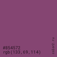Цвет #854572 в цветовой модели RGB обозначается тремя октетами (133, 69, 114) в десятичном формате и #854572 в шестнадцатиричном (hex) формате, которые являются интенсивностью красного 133 (hex 85), интенсивность зелёного 69 (hex 45) и интенсивность синего 114 (hex 72).