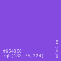 Цвет #854BE0 в цветовой модели RGB обозначается тремя октетами (133, 75, 224) в десятичном формате и #854BE0 в шестнадцатиричном (hex) формате, которые являются интенсивностью красного 133 (hex 85), интенсивность зелёного 75 (hex 4B) и интенсивность синего 224 (hex E0).
