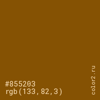 Цвет #855203 в цветовой модели RGB обозначается тремя октетами (133, 82, 3) в десятичном формате и #855203 в шестнадцатиричном (hex) формате, которые являются интенсивностью красного 133 (hex 85), интенсивность зелёного 82 (hex 52) и интенсивность синего 3 (hex 03).