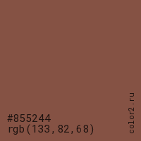 Цвет #855244 в цветовой модели RGB обозначается тремя октетами (133, 82, 68) в десятичном формате и #855244 в шестнадцатиричном (hex) формате, которые являются интенсивностью красного 133 (hex 85), интенсивность зелёного 82 (hex 52) и интенсивность синего 68 (hex 44).